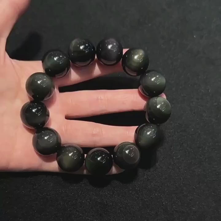 The simplest test is light. Take the bracelet to a lamp or direct sunlight and tilt each bead slowly. Genuine rainbow obsidian will show color — usually green or violet first, then gold — but only in specific angles. The color moves as you rotate the bead, and it disappears when light hits it straight on. Dyed glass or synthetic imitations often show color across the whole surface, evenly, regardless of angle. That evenness is the giveaway. Real rainbow obsidian also feels cool and slightly heavy for its size — glass is denser than most plastic imitations. The surface should be smooth and glassy, not waxy. Under bright light with no iridescence at all, the bead should appear genuinely black, not dark gray or brown. If color shows in low light without tilting, the stone has likely been treated.